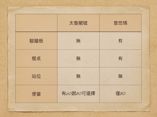 因為這次下台東生平第一次搭太魯閣號,所以想要跟普悠瑪做個比較。 在還沒搭過太魯閣號之前,我一直以為太魯閣號應該跟普悠瑪一樣吧! 就是比自強號快一些,停的站少一些,搭普悠瑪的時候也只會覺得,位置比自強號寬一些,作起來舒服一些,因為很久才搭一次火車,所以也沒有特別感受到普悠瑪跟...